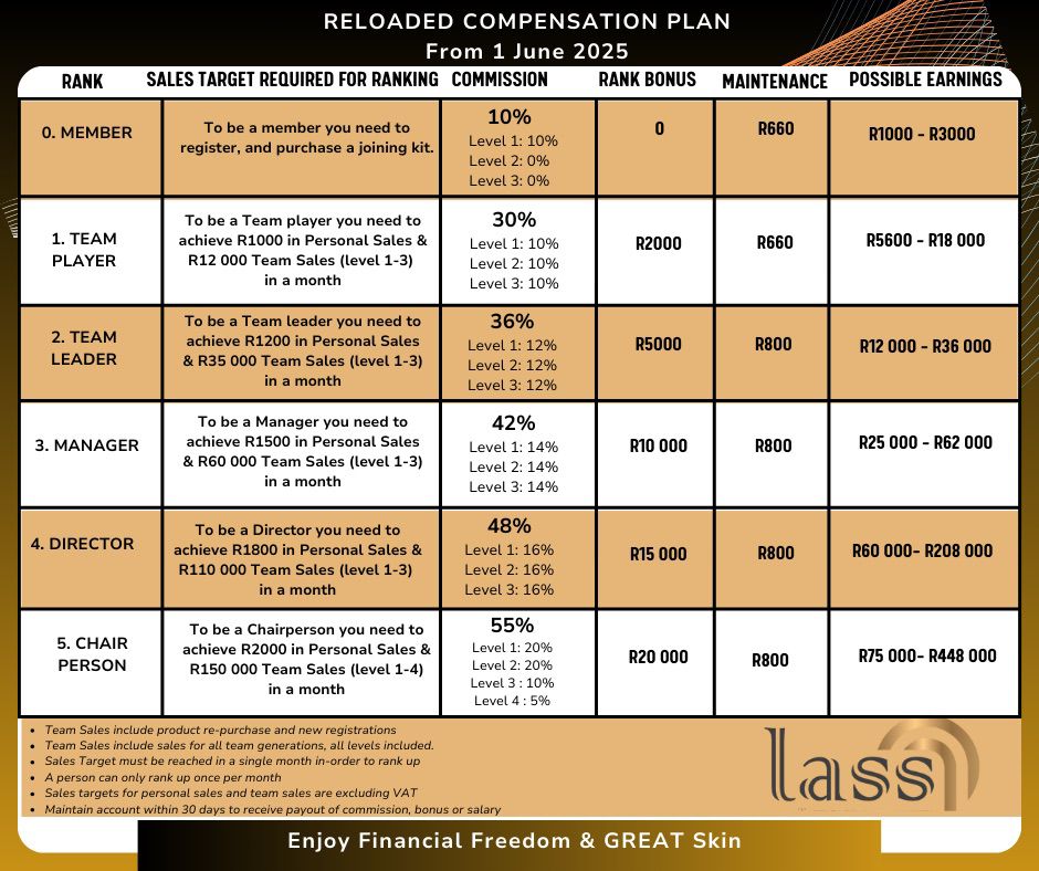 As a Team Leader, you receive 36% Commission from purchases made by your team members, and R5000 rank bonus.